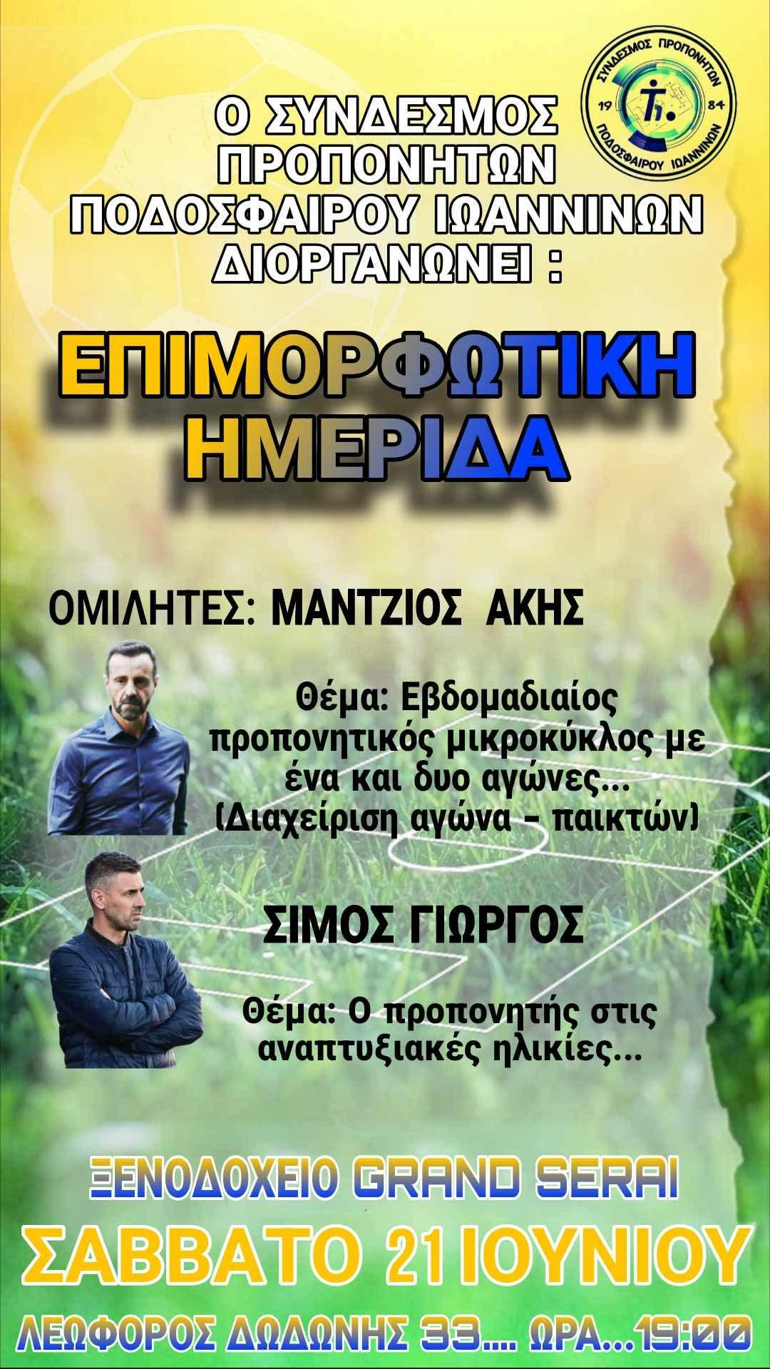 Η Ένωση Ποδοσφαιρικών Σωματείων Ηπείρου και ο Σύνδεσμος Προπονητών Ποδοσφαίρου Ιωαννίνων Διοργανώνουν Σεμινάριο Καρδιοαναπνευστικής Αναζωογόνησης την Παρασκευή 13/6 και ωρα 17:00 στο χώρο του Ενωσιακού Γηπέδου ‘Στάθης Τσανακτσής ‘.